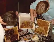 Bierne lukker hver enkelt vokscelle med et låg af voks. Denne forsegling skal skrælles af før tavlerne kan anbringes i en honningslynge, hvor rotationen slynger den tyndtflydende honning ud i et kar. Herfra løber honningen gennem en grov og desuden ofte en fin si.