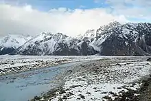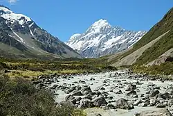 ![]() Hooker-floden med Mount Cook i baggrunden. | |