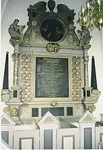 Hylster til døbefonten fra 1699 med våbenskjolde for slægterne Rosenkrantz, Krabbe og Ulfeldt.