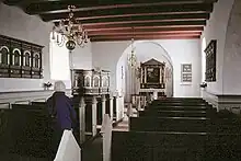 Skibet har bjælkeloft, koret fik indbygget krydshvælv i sengotisk tid. Altertavlen i renæssance har i storfeltet et maleri efter Knud Larsens altertavle i Sankt Markus Kirke på Frederiksberg i København. Prædikestolen er en lektorieprædikestol fra 1609, som oprindelig har siddet i korbuen, sidepanelerne er nu ophængt på skibets vægge, i felterne ses Kristus og de tolv apostle. I kirken ses et sengotisk krucifiks. I skibets vestende har man bevaret den tidligere herskabsstol fra 1642.