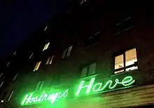 Over hovedporten og indkørslen til haven fra Rolighedsvej, finder man det historiske neon-skilt "Hostrups Have".