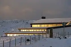 ![]() Hotel Føroyar i vinter. Om sommeren ses dets grønne typisk færøske græstag. | |