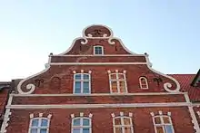 I stedet for dyr sandsten, som man bruge under den nederlandske renæssance, har man brugt hvid maling på gesimser, gavle og omkring vinduerne for at imitere dette, udtryk der er typisk for denne stilperiode. Etageadskillelsen er markeret på facaden med to dobbelte, pudsede og hvidmalede bånd. Vinduerne på hele bygningen er kurvehanksbuede. Vinduerne er hvidmalede, ligesom der er hvide tandsnitgesimser.[4]