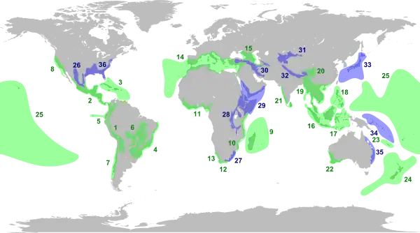 26. Sierra Madres fyrre-egeskove 27. Maputaland-Pondoland-Albany 28. Østafrikas bjergskove 29. Afrikas horn 30. Iransk-anatoliske floraprovins 31. Centralasiens bjerge 32. Østlige Himalaya 33. Japan 34. Østmelanesiske øer
