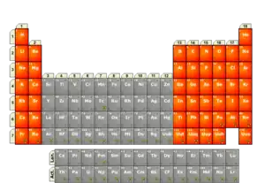 Det periodiske system. Hovedgrupperne er vist med rødt
