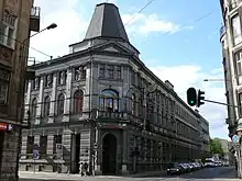 Bygningen har tre etager og er udsmykket med neorenæssancemotiver. Den består af to vinger som står vinkelret på hinanden. Elevationen til anden og tredje etage er opdelt af symmetrisk anlagte pilastre. Hovedindgangen, som fører til en stor hall, befinder sig i det afskårne hjørne, som forbinder bygningens to dele, og som kranses af en ottekantet kuppel.