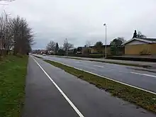 Vejen er anlagt med et spor i hver retning, brede rabatter samt cykel- og gangstier i begge sider.
