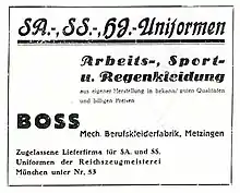 I 1930'erne bestod ledelsen af nationalsocialister og fik derigennem ordrer til fremstilling af uniformer til SA, SS, Wehrmacht og Hitlerjugend. Firmaet beskæftigede tvangsarbejdere fra Vest- og Østeuropa. I efterkrigsopgøret blev Hugo Boss klassificeret som "belastet", da Boss allerede inden 1933 havde indmeldt sig i nazistpartiet.