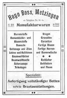 I 1914 blev Boss indkaldt til at gøre tjeneste i 1. verdenskrig som oversergent, og gjorde tjeneste frem til 1918. Efter 1. verdenskrig grundlagde han Schneiderei Hugo Boss i Metzingen, et skrædderi som producerede bl.a. skjorter og arbejdstøj. I 1924 etablerede han en beklædningsfabrik sammen med to kompagnoner. I 1930'erne og 1940'erne lavede firmaet særlige uniformer til det tyske forsvar og diverse naziorganisationer, men også for postvæsenet og jernbanen.