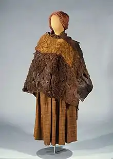Inderslaget var åbent og beregnet til at binde over venstre skulder, af lammeskind og med hårene indad. Det har været repareret flere gange, men reparationerne er udførte med stor dygtighed.[5] Et ternet stykke uldtøj af størrelse og form omtrent som et halstørklæde var ført over skulderen og under venstre arm, hvor det blev samlet med en bennål. Venstrearmen var bundet til kroppen med en tyk rem af oksehud, som gik mellem de to slag.[6]