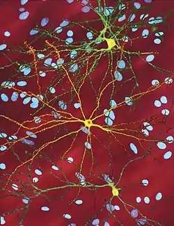 ![]() Et mikroskopibillede af neuroner (gule) med kerneinklusioner (orange), som opstår under sygdomsprocessen. | |
