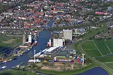 Luftbillede af Husum Å, i midten ses Husums klapbro