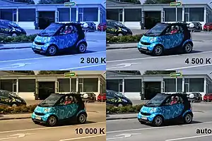 Ud over at brugeren kan beslutte hvidbalanceindstillingen manuelt, kan moderne kameraer også selv foretage denne indstilling med større eller mindre sikkerhed (ofte kaldet AWB – automatic white balance). Problemet er at finde frem til hvilke dele at et billede som er hvid (svarende til , og nævnt i foregående afsnit).