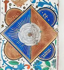 Den hvide rose blev først indført som en devise af Edmund af Langley, 1. hertug af York (1341-1402), den fjerde overlevende søn af kong Edvard 3. af England.[2] En af hans ældre brødre, Johan af Gent, 1. hertug af Lancaster (1340–1399) antog en rød rose som sin devise, den røde Lancasterrose. Deres respektive efterkommere kæmpede senere om Englands trone i flere årtier i borgerkrigen, som er blevet kendt som Rosekrigene efter de to konkurrerende sidelinjers deviser. Den hvide roses symbolisme har religiøse konnotationer, da den (ligesom den hvide lilje) repræsenterer Jomfru Marias renhed, blandt hvis titlerne i den romersk-katolske tro er himlens mystiske rose. I kristen liturgisk ikonografi er hvid symbolet på lys, der karakteriserer uskyld, dyd, glæde og glans.