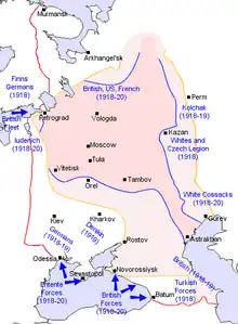 De hvide styrker fik omfattende hjælp af udenlandske styrker, bl.a. 50.000 mand fra Tjekkoslovakiet. Støtten bestod af styrker af varierende kvalitet, men oftest indsat ukoordineret og med ringe resultat. Støtten blev oftest givet for at bekæmpe kommunismen og dæmme op for den. Derimod var det ofte småt med støtten til den hvide sag – både zar-styrets ofte despotiske regime og russisk nationalisme var ikke velset i vesten.[kilde mangler]
