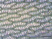 Celler i et grenblad hos Brodspids-Tørvemos. Bemærk, at grønkornene befinder sig i smalle, båndagtige celler, mens hyalocytcellerne er de klare, vandfyldte mellemrum imellem dem.