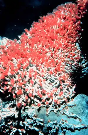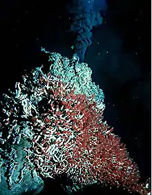 Vældorme (fra Siboglinidae) "græssende" ved foden af en black smoker.