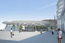 ![]() Stationsbygningen, tegnet af Metro Arkitekter, ovenfor Hyllie station. Malmö Arena ses i baggrunden. | |||