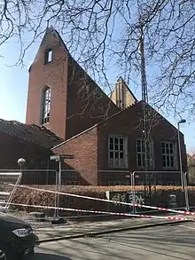 Det skrånende tag kan ses som kirkens tårn. Både røde og gule mursten er anvendt i bygningen. På ydersiden er facaderne opbygget med røde sten, mens der på indersiden er valgt gule sten, der giver et lysere udtryk.