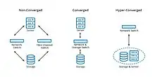 Den primære forskel mellem converged infrastructure og hyper-converged infrastructure er, at i HCI er både SAN-netværket og de underliggende baggrundslager-abstraktioner implementeret virtuelt i software (ved eller via hypervisoren) snarere end fysisk i hardware.[2][1] Fordi softwaredefinerede elementer er implementeret i konteksten af hypervisoren, kan styring af alle ressourcer fødereres (deles) på tværs af alle forekomster af en hyper-converged infrastructure.