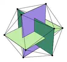 Kanoniske koordinater for hjørnene af et ikosaeder med midtpunkt i origo er {(0,±1,±φ), (±1,±φ,0), (±φ,0,±1)}, hvor φ = (1+√5)/2 er det gyldne snit – bemærk at disse danner tre gyldne rektangler, som står vinkelret på hinanden (ortogonalt, se også tegningen). De 12 kanter af et oktaeder kan deles i det gyldne snit, sådan at de resulterende hjørner definerer et regulært ikosaeder. De fem oktaedre, som definerer et givet ikosaeder, danner en polyedrisk sammensætning.