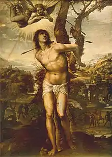 Dette maleri på lærred, som prises af Vasari, er dobbelsidigt malt med den hellige Sebastian på forsiden og Madonna med helgener på bagsiden. Den blev oprindelig anvendt som processionsfane af Confraternita di San Sebastiano ("Sankt Sebastians broderskab") i Camollia nær Siena. Kunstværket stammer fra Sodomas senere virksomhedsperiode. Typisk for Sodomas maleri er det forklarende blikket hos hovedpersonen samt figurerne som befinder sig i halvdunkelt lys.