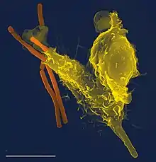En neutrofil (gul) i gang med at æde en miltbrand bakterie (orange).
