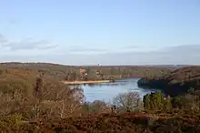 Hald Sø med halvøen med Inderø Skov til højre. I baggrunden ses Hald Hovedgård