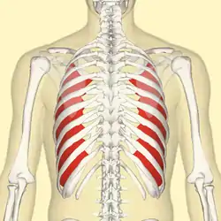 ![]() Inderste interkostalmuskler (rød), set fra ryggen. | |