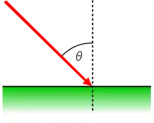Indfaldsvinkel: Den røde pil danner en vinkel på normalen (punkterede linje).