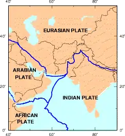 Kollisionen mellem den Eurasiatiske Plade langs med grænsen mellem Indien og Nepal dannede de orogener, som formede det Tibetanske Plateau og Himalaya-bjergkæden, ved at sediment løftede sig op som jord foran en plov. Den indiske plade bevæger sig i øjeblikket mod nordøst med en hastighed på 5 cm/år, medens den eurasiatiske plade bevæger sig mod nord med en hastighed af kun 2 cm/år. Dette medfører, at den eurasiatiske plade deformerer, og at den indiske plade komprimerer med en hastighed på 4 mm/år.