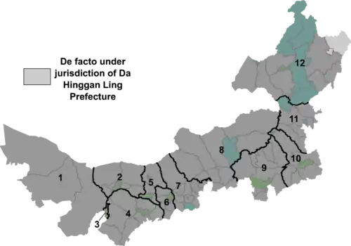 | 12 | Hulunbuir | 呼伦贝尔市 | Hūlúnbèi'ěr shì | Kölön Buyir qota | Hailar | ||