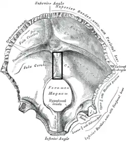 ![]() Nakkeben. Indre overflade (Placering af Crista occipitalis interna markeret som den occipitale sinus i midten). | |