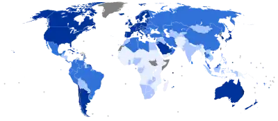 Verdenskortet af kvartil fra Indekset for Menneskelig Udvikling 2014.     Meget høj      Høj      Mellem      Lav      Ingen data