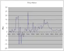 I figuren til højre ses udviklingen i den danske inflation fra 1900 til 2012. Den gennemsnitlige årsinflation 1900-2012 har været på 4,0 %, men der har været store udsving over tid. Det ses således, at der både under og efter 1. verdenskrig og under 2. verdenskrig var nogle år, hvor inflationen lå mellem 15 og 25 %. Til gengæld var der i både 1920'erne og 1930'erne flere år med en kraftig deflation. Siden 2. verdenskrig har prisstigningerne altid været positive, og i 1970'erne og 1980'erne var inflationen typisk et godt stykke større end 5 %. I perioden 1990-2021 havde Danmark imidlertid en ret lav og stabil inflation; den gennemsnitlige årlige inflation 1990-2012 var 2,2 %, og 2013-2020 var den blot 0,7 %.[3] I løbet af 2021 og især 2022 begyndte inflationen imidlertid at stige kraftigt i først USA og siden Europa, og det forplantede sig til det danske prisniveau. I august 2022 var de danske forbrugerpriser ca. 9 % højere end i august 2021.[3]