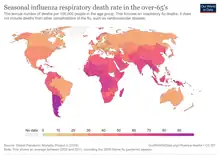 Influenza spreder sig Jorden rundt i sæsonepidemier og resulterer i tusinder af døde og millioner i pandemiske år. Tre influenzapandemier dræbte i det 20. århundrede millioner af mennesker, og hver af disse pandemier skyldtes fremkomsten af en ny streng af virussen i mennesker. Sygdommen hed under den første af de tre pandemier den Spanske Syge som rasede i 1918. Ofte kommer disse nye strenge fra spredningen af en eksisterende influenzavirus til mennesker fra en anden dyreart. En dødelig streng af fugleinfluenza kaldet H5N1 har vist sig at være den største risiko for en ny influenzapandemi siden den krævede sine første menneskeofre i Asien i 1990'erne. Virussen har dog endnu ikke muteret til en form som spredes nemt blandt mennesker.[11]