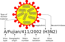 - Influenza A-virus undertype H3N2, stamme A/Fujian/411/2002(H3N2) og influenza A-virus undertype H5N1, stamme A/Fujian (H5N1)Fujian influenza i 2002-2003, 2003–2004, 2004-2005