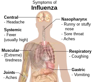Almindeligvis opstår influenzasymptomer pludseligt en til to dage efter infektionen. Oftest er de begyndende symptomer kulderystelser eller kuldefornemmelser, men feber er også almindeligt med kropstemperaturer mellem 38-39 °C.[18] Mange vil være så syge at de må blive i sengen i flere dage med ubehag og kropssmerter, som oftest er værst i ryggen og benene.[2] Influenzasymptomer inkluderer[19]: