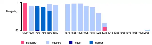 | Historisk udvikling af navnet Ingeborgs popularitet i Norge.[5][9] |