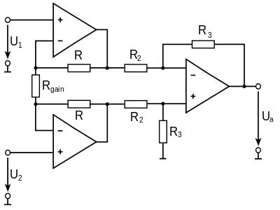 Det mest almindelige instrumentationsforstærker diagram vises i illustrationen. Kredsløbets forstærkningen er givet ved