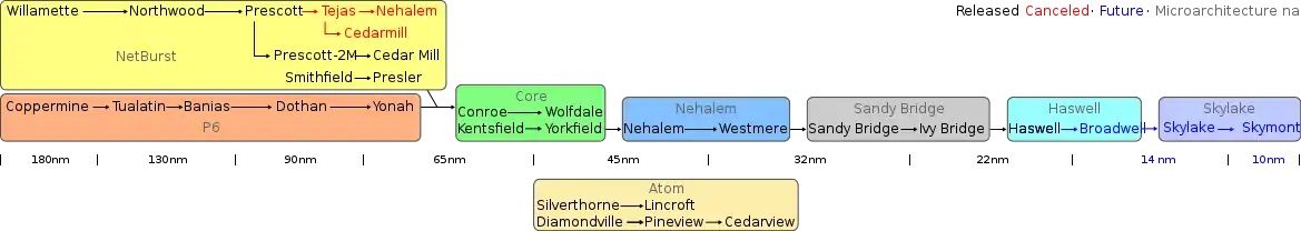 | Tick | Die shrink | Presler, Cedar Mill, Yonah | 65 nm | 5. januar 2006 | Presler | Cedar Mill | Yonah |