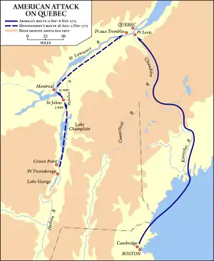 Kongressen gav general Philip Schuyler, lederen af det nordlige militærområde, ordre til at gennemføre en invasion, der skulle drive de britiske styrker ud af Canada.[2] Benedict Arnold, som havde været den første til at foreslå en sådan invasion, fik ikke tildelt kommandoen og tog til Boston, hvor han overbeviste general George Washington om at afsende en hjælpestyrke til Quebec City under hans ledelse.[4]
