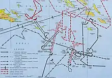 - Feuer, Coastwatching in WWII, pp. 36–7. Det Read formentlig så var skibe fra enten Gotos støttestyrke (Dull, p. 129 (kort)) eller Marumos dækningsstyrke (Lundstrom, p. 145).