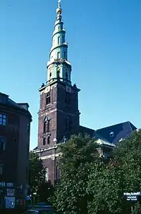 Tårnet på Vor Frelsers Kirke i København, før og efter renoveringen af dets kobberbeklædning i midten af 1990'erne.