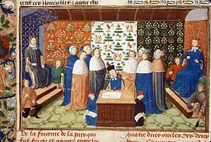 ![]() Dronning Isabella modtager Christine de Pizans Le Livre de la Cité des Dames, ca. 1410-1414, British Library | |