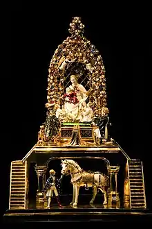 I 1404 gav Isabella Karl en spektakulær ronde-bosse, kendt som Den lille gyldne heste (eller Goldenes Rössl), der i dag befinder sig i en klosterkirke i Altötting, Bayern.[note 7] Samtidige dokumenter identificerer statuen som en nytårsgave, en étrennes, en romersk skik, som Karl havde genoplivet for at fastsætte rang og alliancer i perioden med fraktionsdannelse og krig. Med undtagelse af manuskripter er Den lille gyldne Hest den eneste overlevende dokumenterede étrennes fra perioden. Med en vægt på 12 kilo er guldstykket belagt med rubiner, safirer og perler. Den viser Karl, der knæler på en platform oven over et dobbelt sæt trapper, hvor han præsenterer sig for Jomfru Maria og barnet Jesus, som beskues af Evangelisten Johannes og Johannes Døberen. Et juvel indkapslet espalier eller lysthytte er ovenover. Under står en væbner, der holder den gyldne hest.[73][74] Isabella udvekslede også nytårsgaver med hertugen af Berry. Et eksisterende stykke er Ronde-Bosse statuen af Katharina af Alexandria. [72]