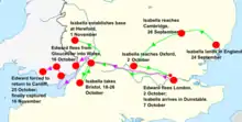 Efter at have undgået Edvards flåde, der var udsendt for at standse dem,[82] landede Isabella og Mortimer den 24. september ved Orwell på Englands østkyst med en lille styrke på mellem 300 og 2.000 soldater, hvor 1.500 er sandsynligt.[83] Efter en kort periode præget af forvirring, hvor de forsøgte at finde ud af, hvor de var landet, rykkede Isabella hurtigt ind i landet, klædt som enke.[84] De lokale tropper, der blev udskrevet for at stoppe dem, skiftede straks side, og næste dag nåede Isabella Bury St Edmunds og ind i landet til Cambridge. Thomas, jarlen af Norfolk, sluttede sig til Isabellas styrker. Også Henrik af Lancaster, bror til den døde Thomas og Isabellas onkel, meddelte, at han sluttede sig til Isabella og marcherede sydpå for at slutte sig til hende.