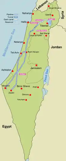 - Fra Jordan kanalen flyder vandet nu ind i et reservoir med en kapacitet på omkring 1 mill. km3, Tsalmon Reservoiret, udgravet i Nahal Tsalmon dalen. Reservoiret regulerer vandet som flyder fra kanalen ind i pumpe-stationen.