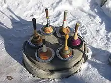 Stokken som man spiller med, vejer ca. 5 kg og består af et håndtag, en skål og en plade.