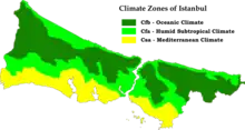 Istanbul har et tempereret klima, med kølige, fugtige vintre og varme, moderat tørre somre. Efter Köppens klimaklassifikation har Istanbul et overgangs fugtigt subtropisk klima (Cfa), kystklima (Cfb) og middelhavsklima (Csa). Frost og sne indtræffer hver vinter, dog i ret få dage. Nogle vintre opstår der "lake effect" sne, som kan lamme byen og blive på jorden i mere end en uge. Selvom det sene forår og sommeren er de tørreste årstider, er der ingen tør sæson, da der er moderat nedbør. Forår og efterår i Istanbul er milde, men kan være omskiftelige og variere fra kolde og snerige til varme og fugtige. Den årlige luftfugtighed er altid høj og falder sjældent til under 70%. Som et resultat af denne høje luftfugtighed føles vinteren ofte meget koldere og somrene meget varmere.
